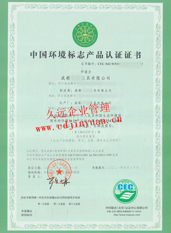 家具有害物質(zhì)限量認(rèn)證證書